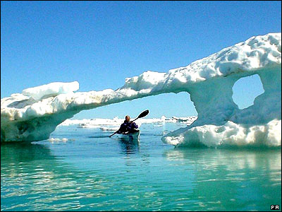 کاياک سواری در آبهای يخزده گروئنلند. يک شرکت بريتانيایی موفق شده است تعداد زيادی از اين کاياکها را در گروئنلند، يعنی جايی که کاياک نخستين بار در آنجا اختراع شد، به فروش برساند. |