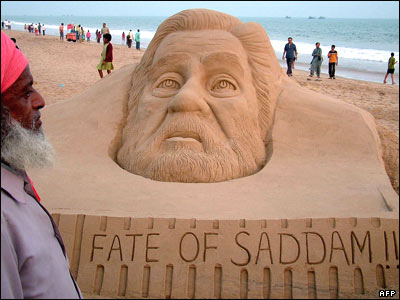 مجسمه ای ماسه ای از صدام حسين رييس جمهوری سابق عراق در يکی از سواحل هند. دادگاه تجديد نظر عراق روز سه شنبه حکم اعدام صدام حسين را تاييد کرد. بر اساس قوانين عراق، حکم بايد ظرف سی روز اجرا شود.