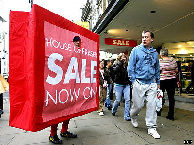 مردی در لباس يک ساک خريد عظيم، آغاز حراج در يکی از فروشگاههای بزرگ لندن را تبليغ می کند. از امروز حراج های بعد از کريسمس در بيشتر فروشگاههای لندن آغاز شد.