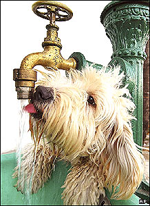 سگی در حال نوشيدن آب در شمال بخارست، پايتخت رومانی. |