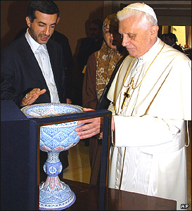 اسفنديار رحيم مشايی رئيس سازمان ميراث فرهنگی و گردشگری ايران هنگام اهدا يک گلدان به پاپ بنديکت شانزدهم در واتيکان