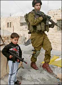 يک پسر بچه فلسطينی با مسلسل اسباب بازی اش در کنار سرباز اسرائيلی ای که در شهر الخليل در کرانه باختری گشت زنی می کند.