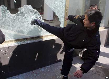 يک مقام شهرداری پکن شيشه ساختمانی را که به طور غير قانونی در اين شهر بنا شده خرد می کند.