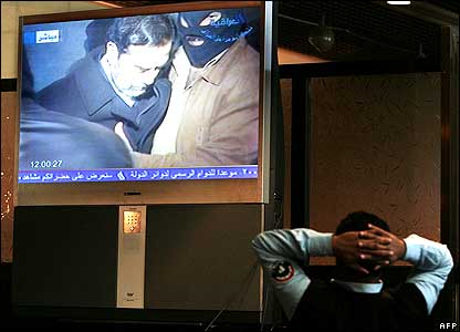 يک پليس عراقی مشغول تماشای صحنه اعدام صدام حسين در تلويزيون