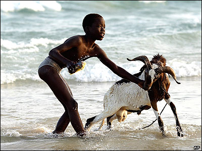 پسر سنگالی در حال شستن بز خود برای مراسم قربانی عيد