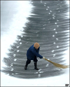 زن چينی در حال برف روبی در شهر جينان مرکز ايالت شان دونگ در شرق چين.