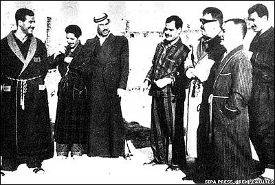 صدام حسين در منطقه ای فقيرنشين در شمال عراق پرورش يافت. به حزب بعث پيوست و به سال 1963 در کودتای ناموفقی عليه عبدالسلام عارف، رئيس جمهور وقت عراق شرکت جست که منجر به حبس او شد. او در سال 1966 با تعدادی از همدستانش در کودتا، از زندان گريخت (عکس بالا).
