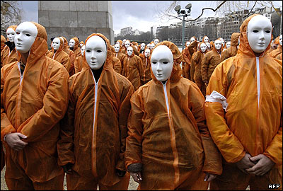 فعالان سازمان عفو بين الملل در پاريس درحالی که لباسهای نارنجی مشابه لباس زندانيان گوانتانامو به تن دارند، به ادامه حبس اين زندانيان اعتراض می کنند.