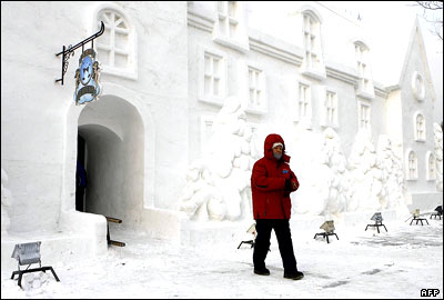 زن چينی در مقابل خانه ای برفی در شهر هاربين در شمال چين. در گوشه و کنار اين شهر که ميزبان بيست و سومين جشنواره بين المللی يخ و برف است، مجسمه هايی از يخ و برف ديده می شود. |