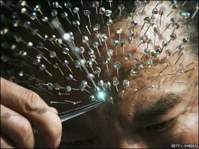 وی شنگچو، مرد چينی، در حال اجرای طب سوزنی بر روی خود. او 1200 سوزن را به پوست سر خود فرو کرده است. او رکوردار استفاده از بيشترين تعداد سوزن - 1790 سوزن - روی صورت خود است.