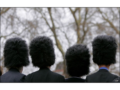 گروهی از اعضای پارلمان بريتانيا که کلاه هايی از خز مصنوعی بر سر گذاشته اند به استفاده از پوست خرس واقعی در کلاه های گارد ملکه معترضند. |