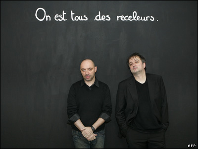 در نمايشگاهی در پاريس با عنوان "سلطه"، دنيس روبرت، روزنامه نگار فرانسوی و فيليپ پاسکه، نقاش، در مقابل تابلوی خود که بر آن نوشته شده "همه ما کالاهای دزدی دريافت می کنيم" ايستاده اند.