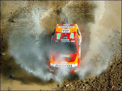 يک راننده ژاپنی و کمک راننده فرانسوی در خودروی ميتسوبيشی در سومين مرحله از رالی داکار در مراکش.