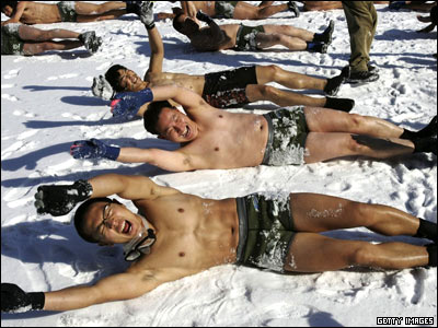 شرکت کنندگان در مسابقه شيرجه در آب سرد در کره جنوبی آماده می شوند تا به داخل آب رودخانه ای يخزده شيرجه بروند.