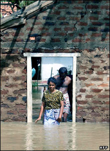 اعضای يک خانواده سريلانکايی خانه خود را که در اثر جاری شدن سيل زير آب فرو رفته، ترک می کنند. رانش زمين و سيلاب ناشی از بارانهای موسمی در سريلانکا حداقل ۱۸ کشته بر جای گذاشته و ۶۱ هزار نفر را بی خانمان کرده است.