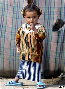 دختربچه بی خانمان عراقی در مقابل چادر خانواده اش در يکی از اردوگاههای آوارگان در عراق. در طی چند ماه گذشته هزاران عراقی به دليل درگيری های فرقه ای در اين کشور بی خانمان شده و در سرمای زمستان با شرايط دشواری مواجه اند.