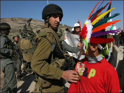 سرباز اسراييلی در رويارويی با يک نوجوان فلسطينی که در جريان تظاهراتی در شهر نابلس در کرانه باختری لباس سرخپوستان آمريکا را بر تن کرده است. اين تظاهرات همزمان با سفر وزير امورخارجه آمريکا به کرانه باختری صورت گرفت.