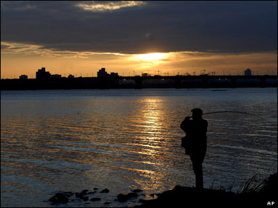 مردی در حال ماهیگیری در کنار رودخانه دنپرو در اوکراین. عدم بارش برف در این کشور تعجب مردم این کشور را برانگیخته است