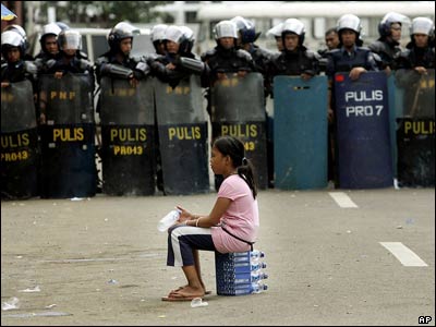 دختری دست فروش در مقابل صف نیروهای ضد شورش در شهر سبو در فيلیپین. این شهر شاهد اعتراضهایی همزمان با برگزاری اجلاس اتحادیه کشورهای جنوب شرق آسیا، (آسه آن) بوده است