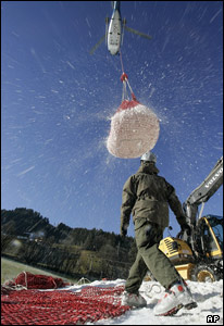 هلیکوپتری در حال انتقال برف به پیست اسکی در اتریش. امسال تعداد زیادی از پیستهای اسکی این کشور با مشکل کمبود برف مواجه اند