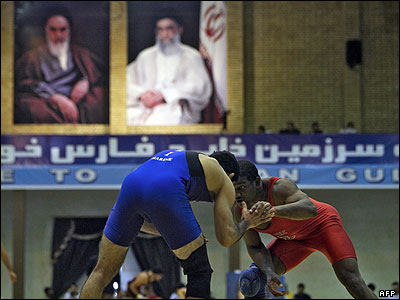 حميد رازانی، کشتی گير ايرانی در حال نبرد تن به تن با حريف آمريکايی خود، آنتونی راميکو بلکمون، در مسابقات بين المللی کشتی تختی در بندرعباس.