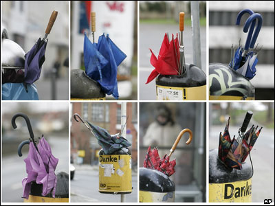 مجموعه ای عکس از چترهای شکسته شده در سطلهای زباله شهر برمن در شمال آلمان. در اثر طوفان شديد روز گذشته در آلمان حداقل 10 نفر کشته شدند.