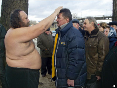 در کيف پايتخت اوکراين، مردی که تصور می شود دارای قدرت و انرژی خاص درمانی است، دست خود را برای انتقال انرژی و درمان بر روی بدن مراجعه کنندگان می گذارد.
