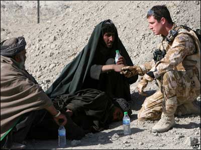 سرباز ارتش بريتانيا در جريان يک برنامه امداد رسانی نيروهای بين المللی کمک به امنيت در افغانستان (آيساف) به مردی افغان آب آشاميدنی می دهد.
