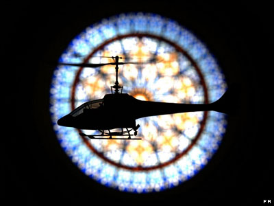 پرواز يک مدل هليکوپتر از مقابل پنجره ای با شيشه های رنگين، در نمايشگاه مدلهای مهندسی در لندن.