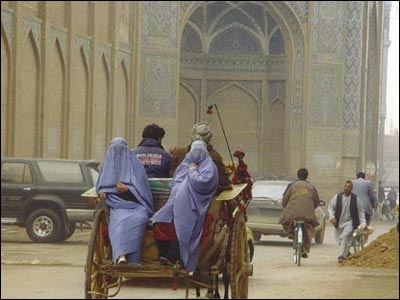 زنان برقع پوش سوار بر گادی (کالسکه اسبی) در ضلع شمالی مسجد جامع هرات