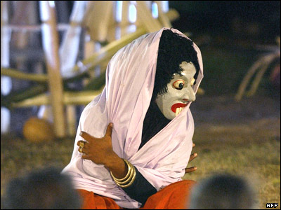 رقصنده سريلانکايی در حال اجرای مراسم سنتی ای که تصور می شود می تواند ۱۸ نوع بيماری را دفع کند. |