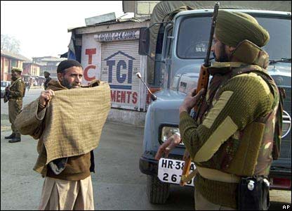 مامور پليس هندی در حال بازرسی يک مرد کشميری. در آستانه مراسم روز جمهوری در هند، مقامات هندی اقدامات امنيتی شديدتری را اتخاذ کرده اند.