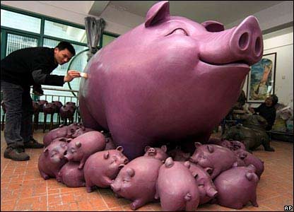 در آستانه سال نوی چينی که امسال نماد آن خوک است، يک هنرمند چينی مجسمه ای را آماده جشنهای آغاز سال نو می کند.
