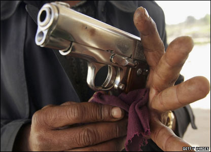 يک فروشنده فلسطينی اسلحه در بازاری محلی در شهر غزه هفت تيری را برای فروش جلا می دهد. با وخامت اوضاع امنيتی و وضعيت نابسامان اقتصادی در مناطق فلسطينی، برخی فروشندگان به فروش اسلحه و مهمات روی آورده اند.