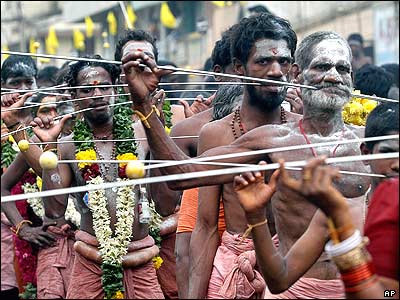 پيروان آئين هندو در مراسمی مذهبی در شهر مدرس هند. اين مردان گونه هايشان را با ميله آهنی سوراخ می کنند تا آرزوهايشان برآورده شود.