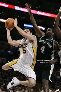 در مسابقات ليگ بسکتبال حرفه ای آمريکا، ان بی ای، سن آنتونيو اسپورز در وقت اضافه، لس آنجلس ليکرز را ۹۶ به ۹۴ شکست داد. جوردن فارمر از تيم ليکرز، به سمت سبد حمله می کند.