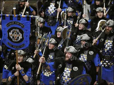 گروهی از شرکت کنندگان در جشنواره آتش و مشعل در جزیره "Shetland" در شمال اسکاتلند که به مناسبت ورود وایکینگهای به بریتانیا از راه این جزیره برگزار می شود.