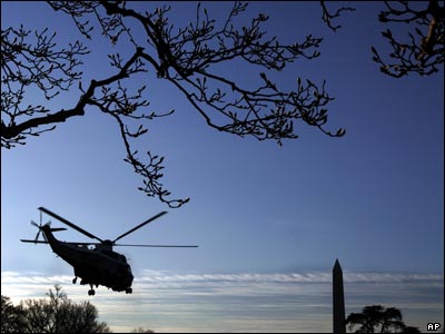 چرخبال مخصوص رییس جمهور آمریکا در حال بلند شدن از محوطه کاخ سفید.