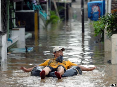 مردی بر روی یک قایق پلاستیکی در خیابانهای سیل زده جاکارتا در اندونزی. میزان وقوع سیل در اندونزی در سالهای اخیر افزایش یافته و کارشناسان محیط زیست تغییرات اکو سیستمی مانند آب شدن یخهای قطب شمال را عامل اصلی این امر می دانند.