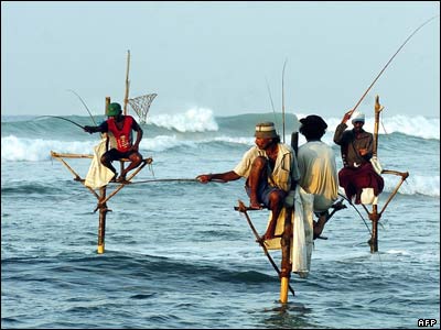 ماهیگيران سریلانکایی مشغول صید ماهی به روش سنتی. 140 کمک کننده مالی به سریلانکا خواستار گفتگو دولت این کشور با جنگجویان ببرهای تامیل شدند.