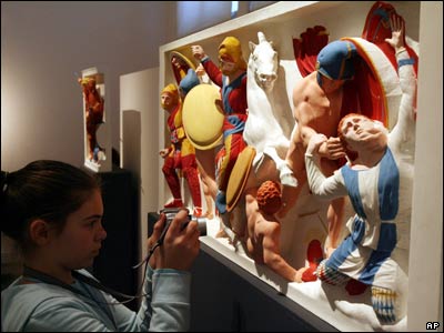 دختری در حال نقاشی از طرحی ساخته شده از گچ در موزه ملی باستانشناسی یونان در آتن که نشانه حمله اسکندر مقدونی به ایران است. |