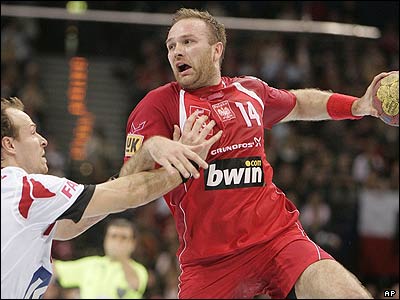 در مسابقات نيمه نهايی جام جهانی هندبال که در هامبورگ آلمان برگزار شد، تيم لهستان با نتيجه 36-33 دانمارک را شکست داد و برای فينال روبروی آلمان قرار خواهد گرفت. (تصويری از ماريوس خوراسيک بازيکن لهستان سمت چپ)