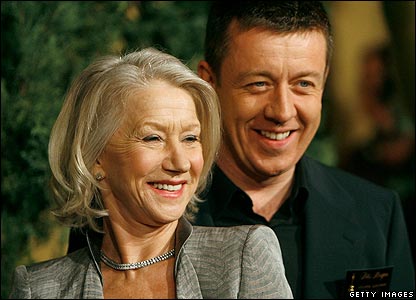 هلن ميرن، بازيگر نقش ملکه الیزابت در فيلم " ملکه" همراه پيتر مورگان فيلمنامه نويس اين فيلم که هر دو نامزد اسکار شده اند.