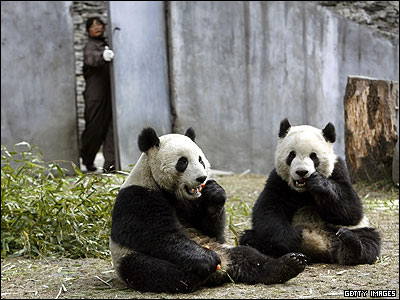 دو پاندا در يک مرکز تحقيقاتی در چين در حال خوردن هويج هستند. روز شنبه، مراسمی به مناسبت موفقيت در حفظ 18 پاندا در اين مرکز برگزار می شود.