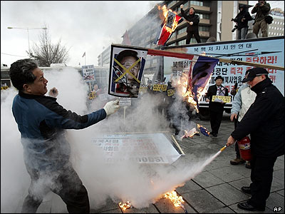 عکس رهبر کره شمالی و پرچم اين کشور در تظاهراتی عليه این کشور در کره جنوبی به آتش کشيده شد.