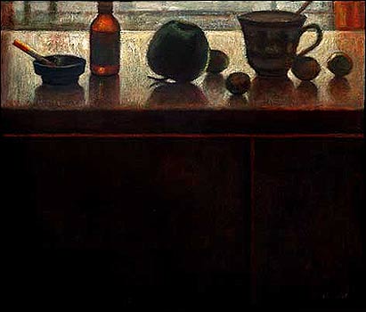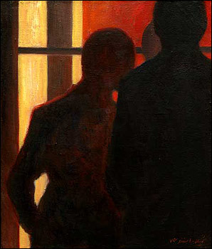 غلبه رنگهای گرم در زمينه های سايه و تاريک و مات و يا تصاوير حاشيه ای که در کنار موضوع اصلی قرار می گيرد، زيبايی های زندگی و شوق حرکت را بر آن غلبه می دهد. اين موضوع را در ملاقات مرد گل به دست در عيادت بيمار، در تابلوی چرخ خياطی و ماهی ديده می شود. تابلويی که در خلوت کوچه ای جوی آب در ميان آن جاری است يا قريه ای که ريل راه آهن از ميان می گذرد اين موضوع مشاهده می شود.