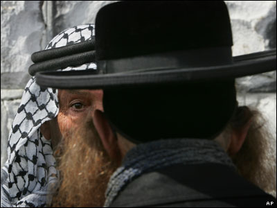 یک عضو گروه افراطی یهودی در حال صحبت با یک فلسطینی در کنار مسجد الاقصی. مسلمانان نسبت به حفاری های دولت اسرائیل در کنار این مکان مقدس معترض هستند