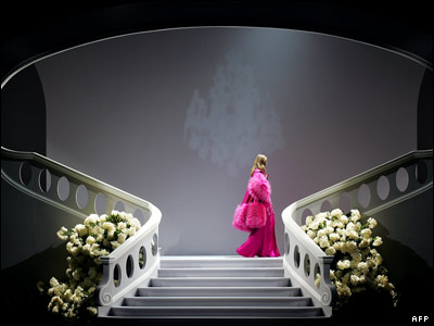 یک مدل در حال نمایش لباس های طراحی شده توسط جان گالیانو در پاریس