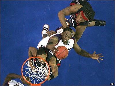 در ادامه مسابقات بسکتبال دانشگاهی جنوب غربی آمریکا (SEC)، در دیدار جورجیا و آوبورن، بازیکنان دو تیم برای تصاحب توپ تلاش می کنند. |