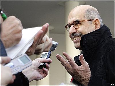 محمد البرادعی، رييس آژانس بين المللی انرژی اتمی، در حال گفتگو با خبرنگاران در فرودگاه وین پیش از سفر خود به چین و کره شمالی. محمد البرادعی قرار است که در گفتگو با مقامات کره شمالی شرایط را برای برنامه متوقف کردن این کشور بررسی کنند